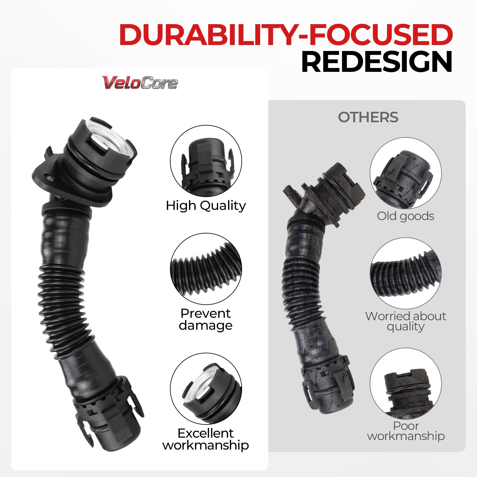 Over time, the original rubber hose can deteriorate from heat and oil exposure, leading to cracks, leaks, and poor engine performance. Symptoms of a failing crankcase vent hose include rough idle, oil consumption, and check engine lights. Replace it now to maintain your BMW's legendary performance.