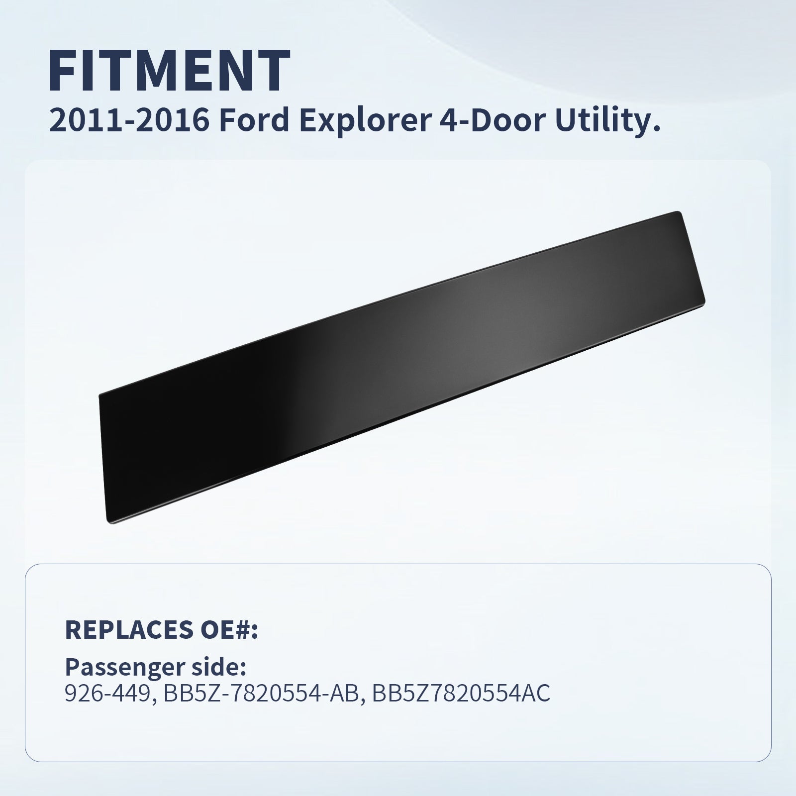 Fits Ford Explorer models from 2011 to 2016. This right-side B-pillar molding seamlessly integrates with your vehicle's existing trim system.