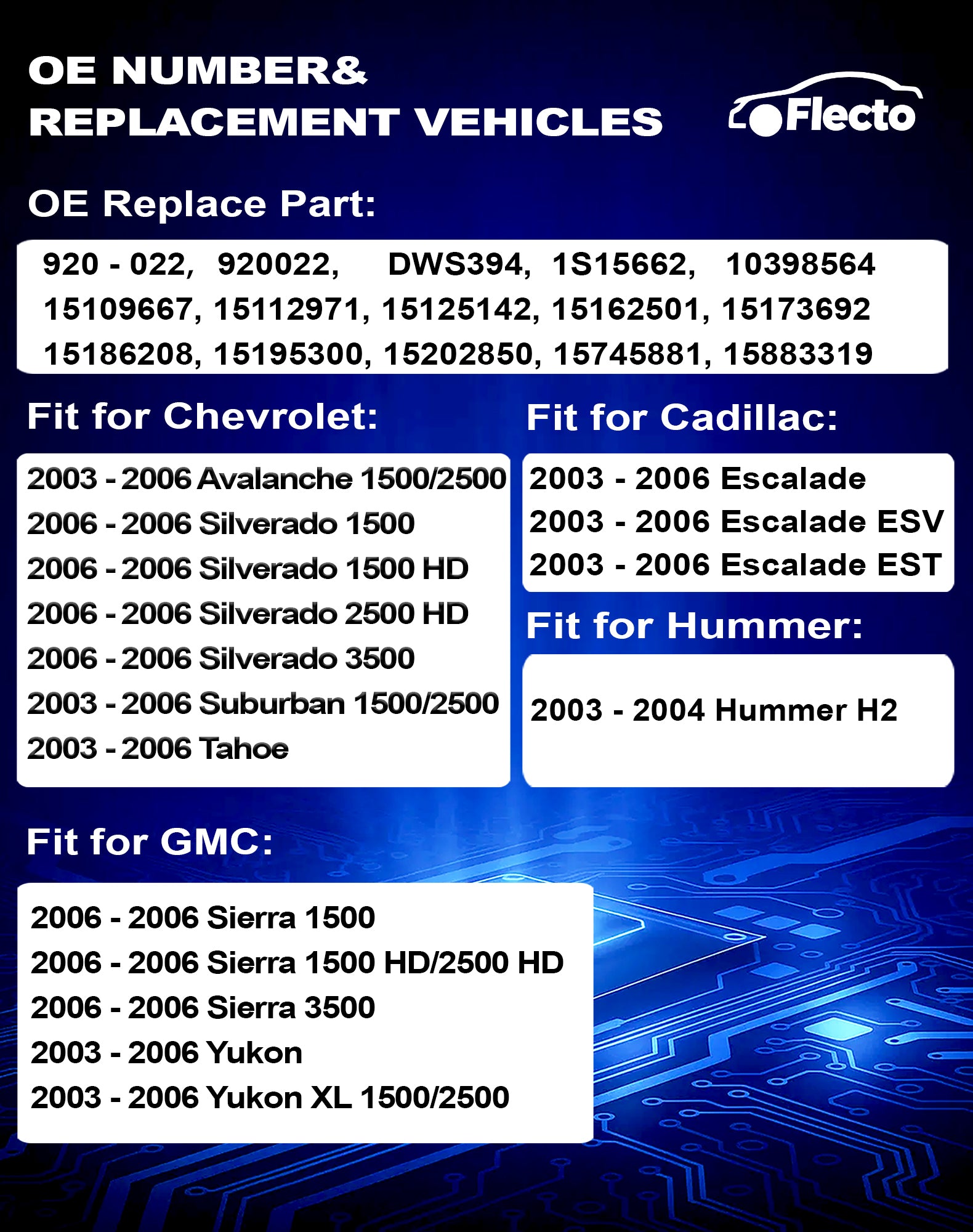 Upgrade your vehicle's power window functionality with this master power window switch designed specifically for select GM vehicles. This driver-side control switch integrates seamlessly with door lock and folding mirror functions, making it a comprehensive solution for your vehicle's control needs. Compatible with multiple GM models from 2003-2006, including Cadillac Escalade, Chevrolet Silverado, Avalanche, Suburban, Tahoe, GMC Sierra, Yukon, and Hummer H2. The switch assembly (part number 15883319) provides convenient control over your vehicle's power windows, door locks, and mirror adjustments from the driver's position.