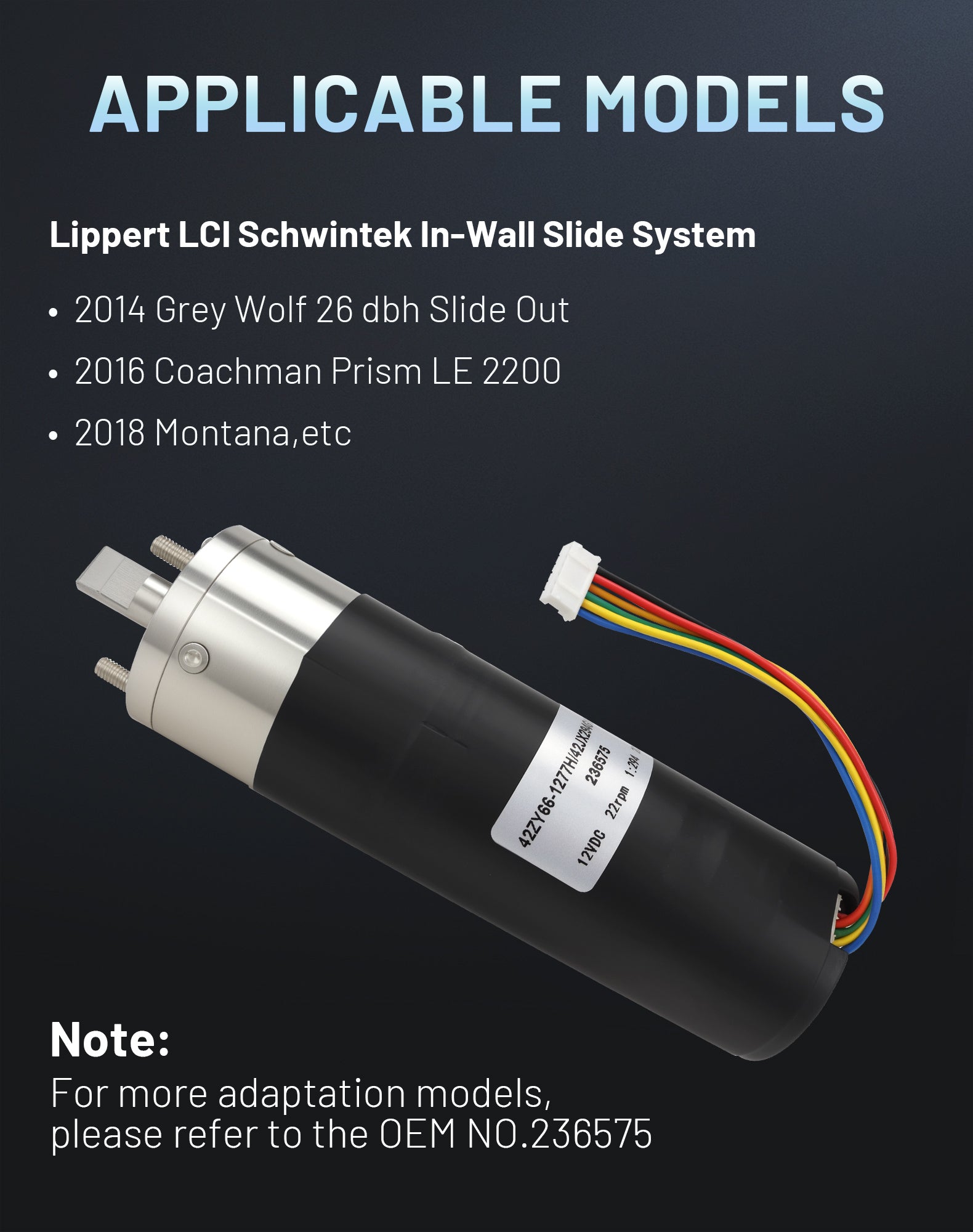 Keep your RV slide-out operating smoothly with this high-quality in-wall slide-out motor. Designed as a direct OEM replacement for Lippert Schwintek systems, this high-torque motor ensures reliable slide-out operation for your travel trailer and camper.