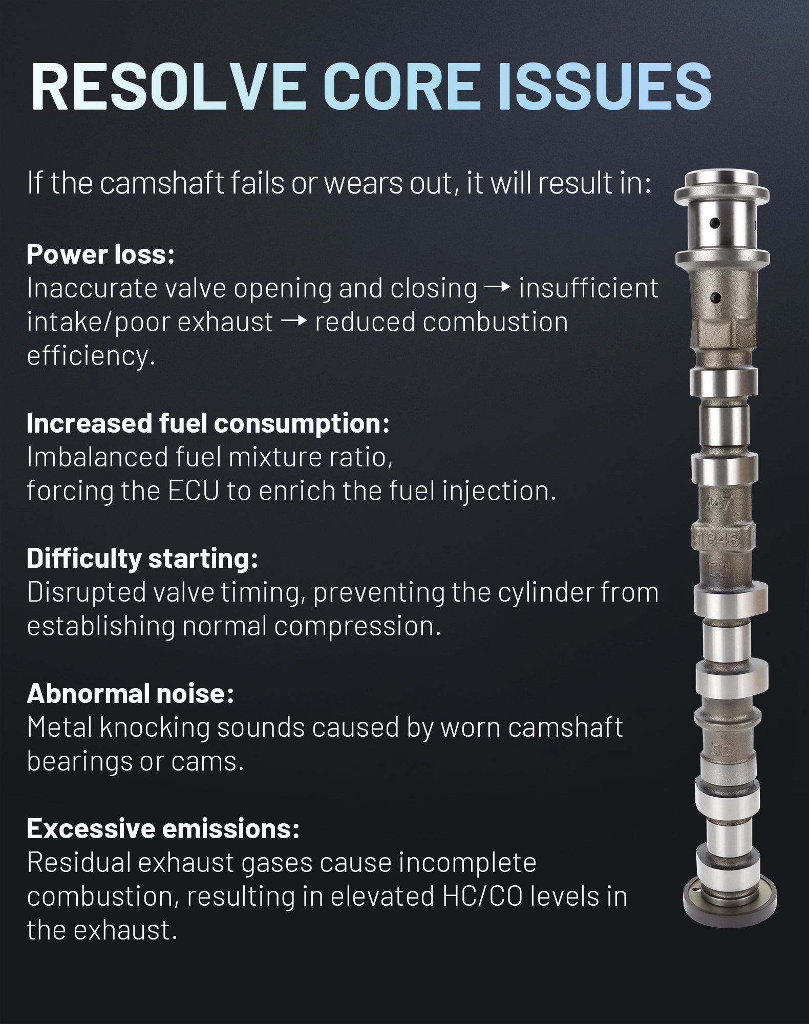 Over time, camshafts can wear from constant friction, leading to poor performance, rough idle, and engine noise. Replace it now to restore smooth operation.