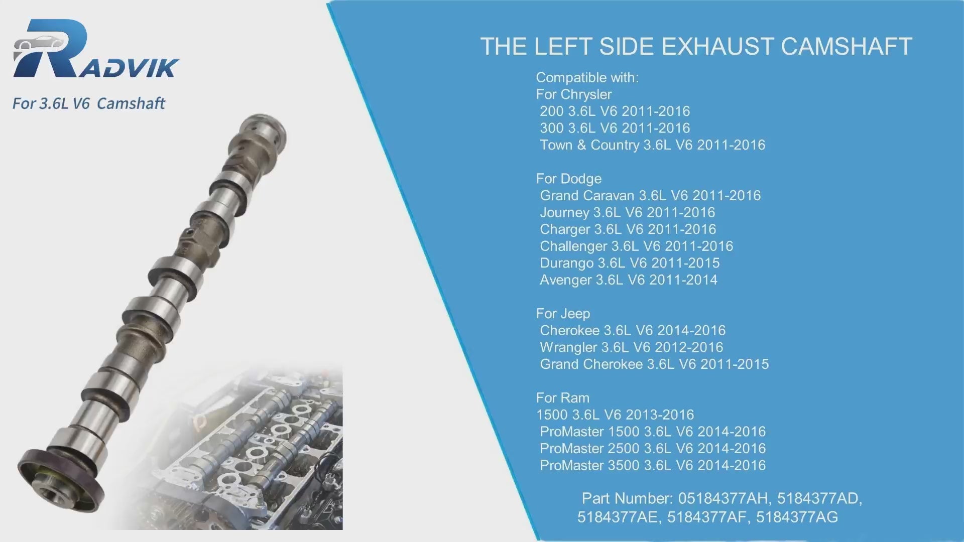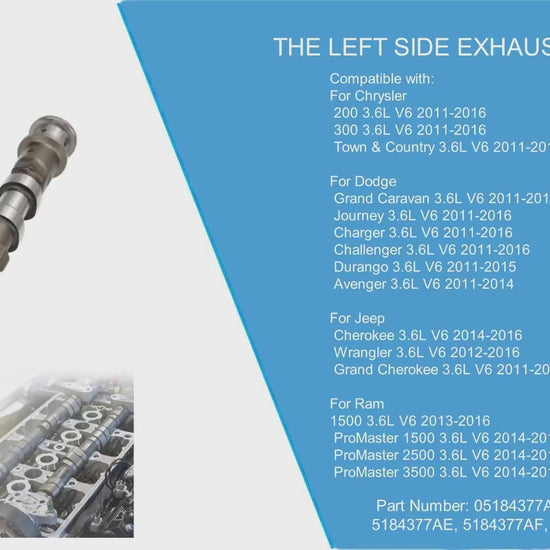 Restore your engine's optimal performance with this high-quality exhaust camshaft. Designed as a direct OEM replacement for 3.6L Pentastar V6 engines, this precision-engineered left side exhaust camshaft ensures proper valve timing and reliable engine operation.