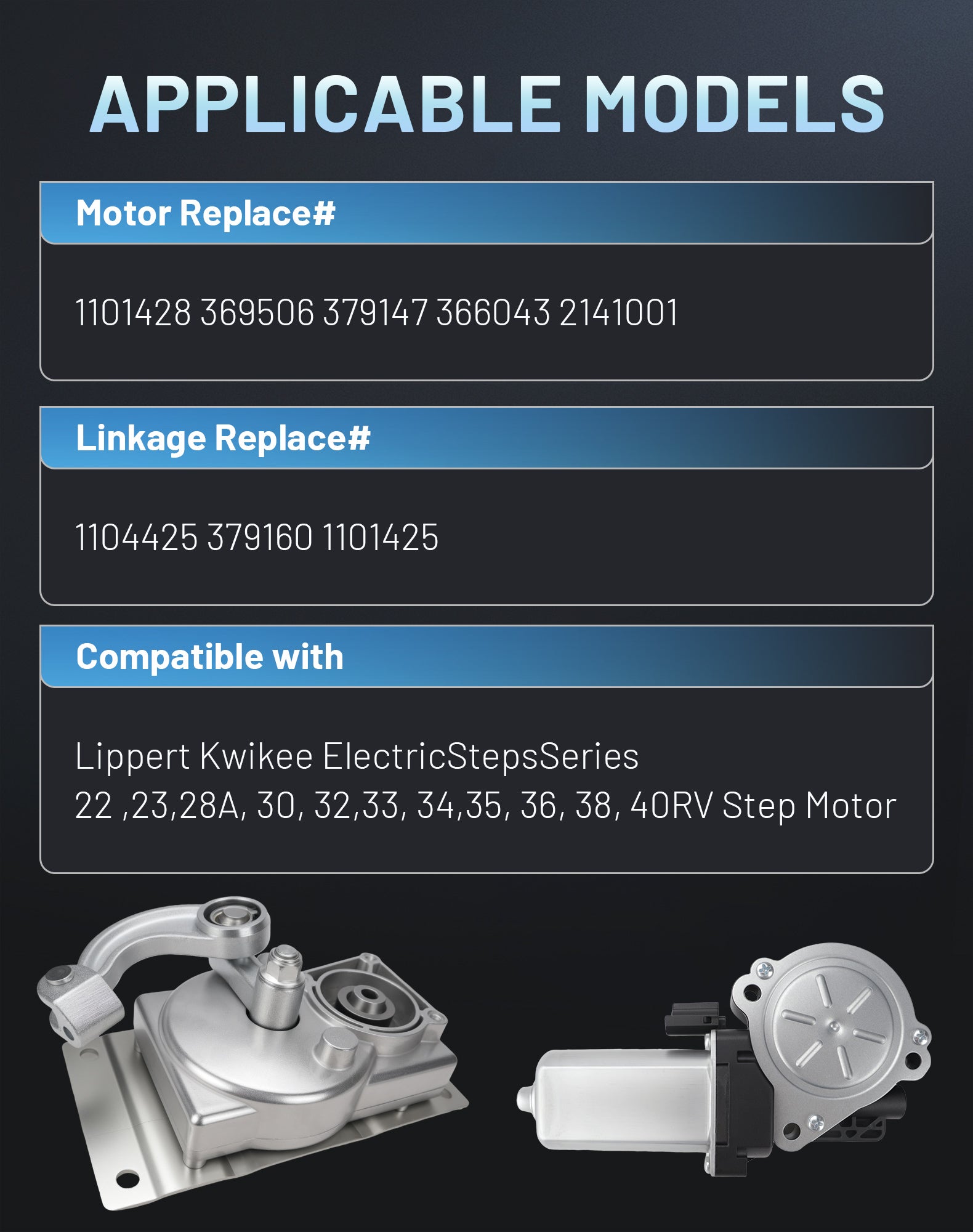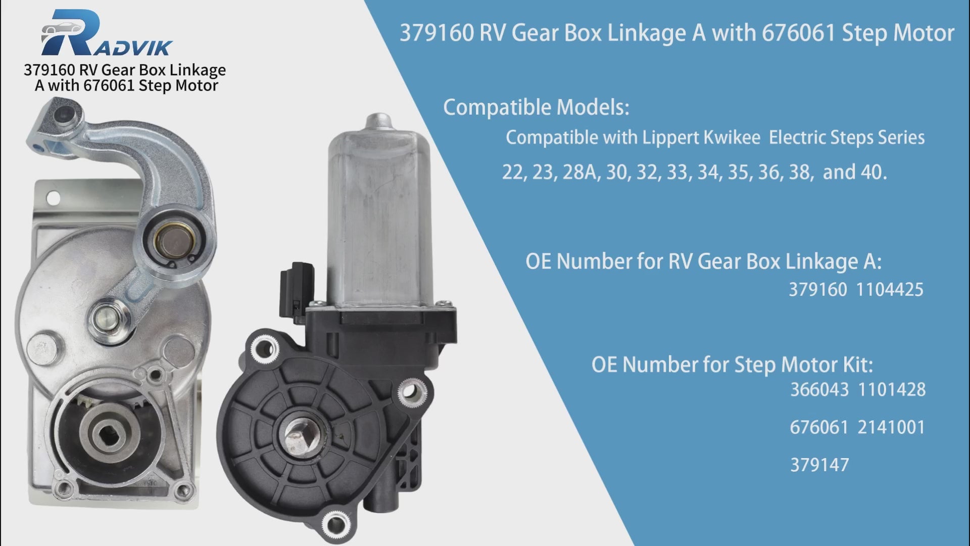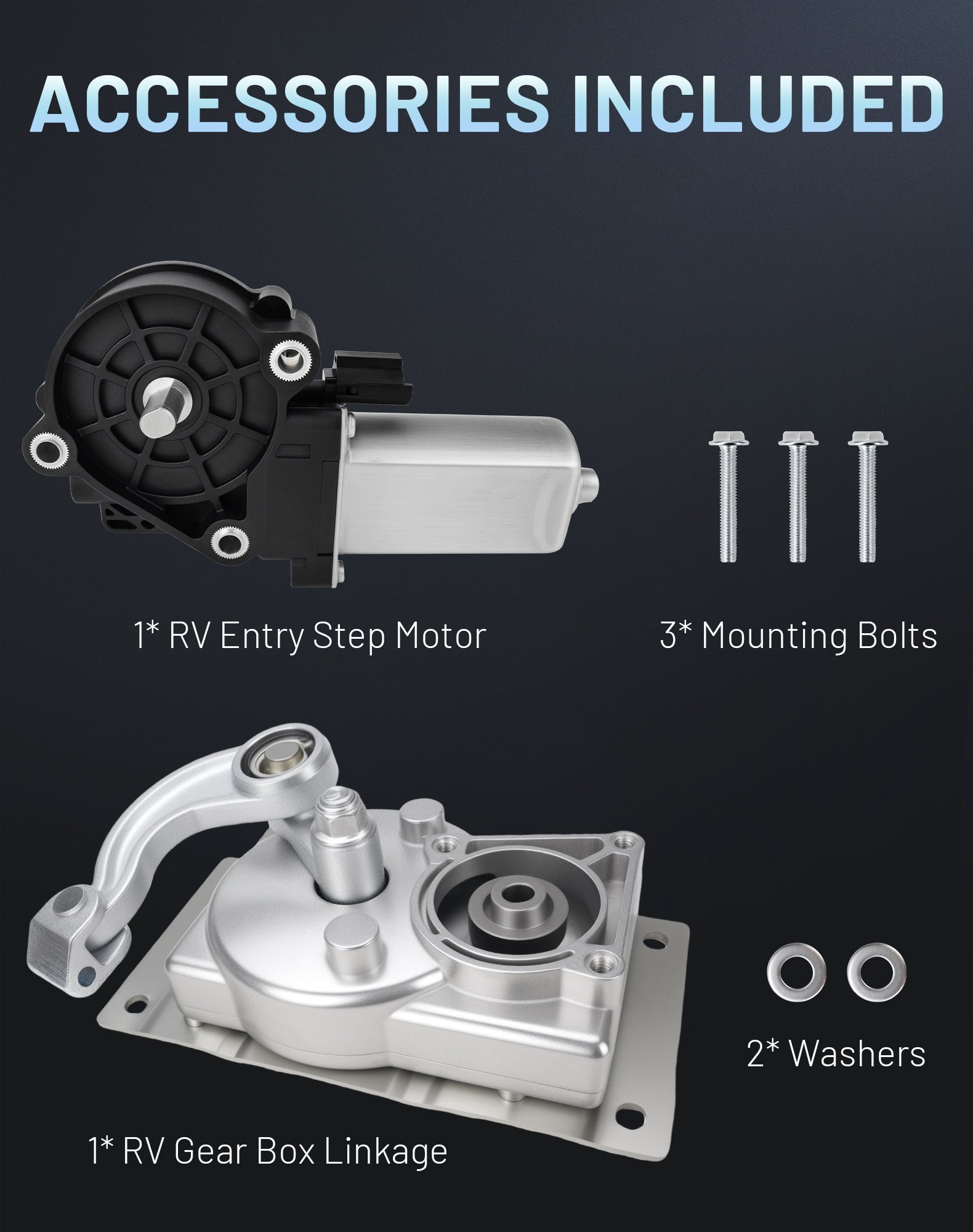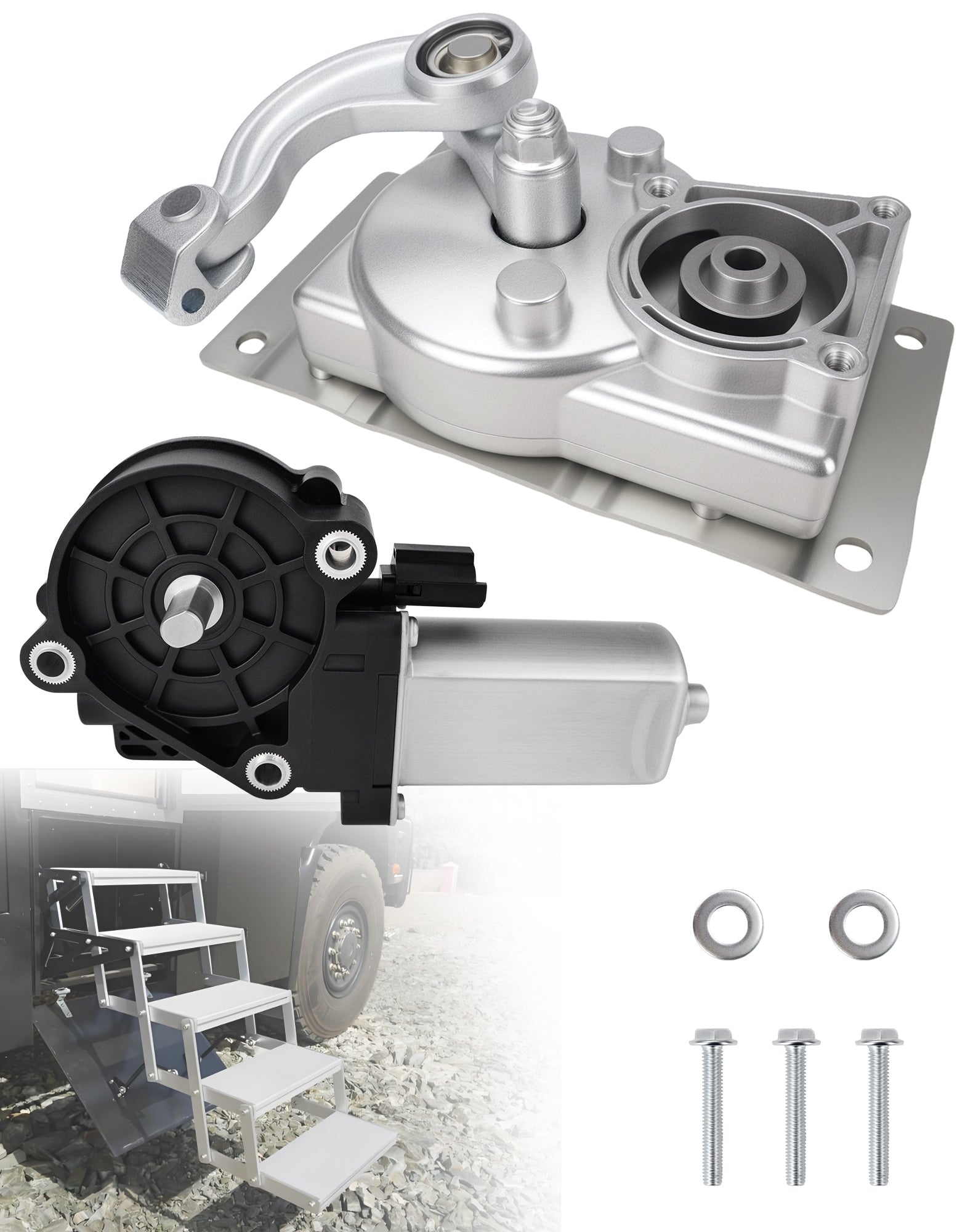 This gear box linkage and step motor is designed for RVs equipped with Lippert or Kwikee automatic entry step systems.