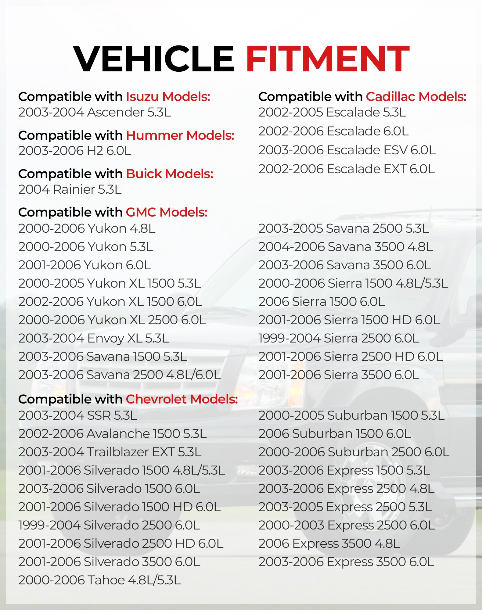 Engine Compatibility: 4.8L, 5.3L, 6.0L V8 engines